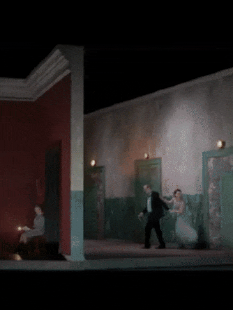 À l’intérieur de cet espace clos, les projections créées par le Studio A+E jouent avec la transparence et les ombres, révélant ou dissimulant des fragments d’images au rythme des révélations dramatiques. Ces interventions visuelles, volontairement subtiles, amplifient la montée en intensité et renforcent la sensation d’étouffement qui traverse tout l’opéra. En lien étroit avec la lumière et la musique, l’image devient ici un langage à part entière, prolongeant les silences, appuyant les tensions et accompagnant les éclats émotionnels.