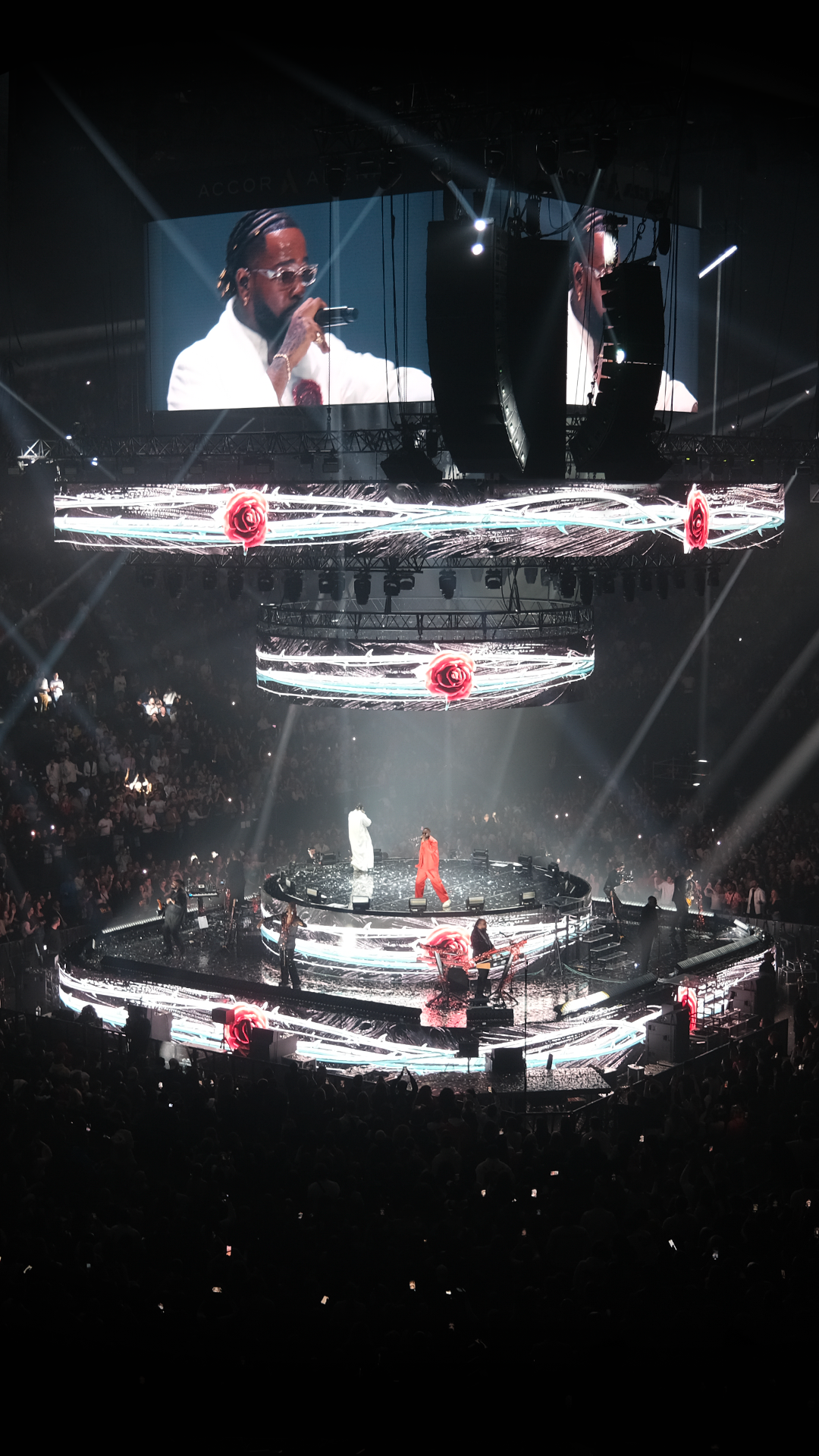 Grâce à cet écran modulable encerclant les artistes, les projections visuelles – textures mouvantes, lumière sculptée, rythmes visuels – ont interagi au millimètre près avec l’énergie scénique. Le rendu visuel, pensé comme un paysage à la fois graphique et émotionnel, a soutenu la force narrative du show et renforcé l’expérience mémorable vécue par les spectateurs. Cette performance sold out à l’Accor Arena marque une réussite visuelle aussi forte que musicale, faisant de cette production un moment marquant de l’année 2024 dans l’univers du live R&B/urban en France.